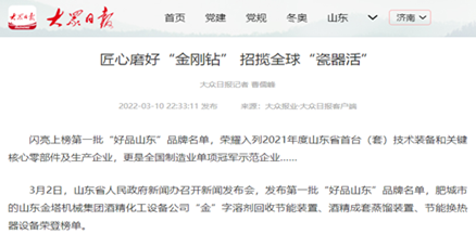 時代的華章,總是在奮斗中書寫。備受全市人民矚目的市十八屆人大五次會議和市政協九屆五次會議勝利召開。這次“兩會”進一步清晰目標任務,更凝成了思想共識,積聚了奮進前行的磅礴力量。 “十三五”期間,高新技術產業(yè)占比62.3%,比“十二五”末提高33.1個百分點。擁有國家制造業(yè)單項冠軍5家、綠色工廠4家、知識產權優(yōu)勢企業(yè)5家,省制造業(yè)單項冠軍7家、瞪羚企業(yè)6家、隱形冠軍7家、專精特新中小企業(yè)65家,2020年獲評山東優(yōu)質品牌19個,山東知名品牌24個,參與制修訂各類標準48項。其中山東金塔集團擁有: 國家高新技術企業(yè)(3家):肥城金塔酒精化工設備有限公司、肥城金塔機械科技有限公司、肥城金威機械有限公司。 國家制造業(yè)單項冠軍(2家):肥城金塔酒精化工設備有限公司、肥城金塔機械科技有限公司。 知識產權優(yōu)勢企業(yè)(1家):山東金塔機械集團有限公司。 瞪羚企業(yè)(1家):肥城金塔機械科技有限公司。 隱形冠軍(1家):肥城金塔酒精化工設備有限公司。 山東省專精特新中小企業(yè)(5家):山東金塔機械集團有限公司、肥城金塔酒精化工設備有限公司、肥城金塔機械科技有限公司、肥城金威機械有限公司、肥城泰西無紡材料有限公司。 山東優(yōu)質品牌(3個):山東金塔機械集團有限公司“金”字牌酒精蒸餾塔、肥城金塔機械科技有限公司“金”字牌無水酒精回收塔節(jié)能裝置、肥城金塔酒精化工設備有限公司“金”字牌燃料乙醇節(jié)能蒸餾裝置。 山東知名品牌:山東金塔機械集團有限公司金字牌“蒸餾塔”。 主持制定1項行業(yè)標準的企業(yè):山東金塔機械集團有限公司。